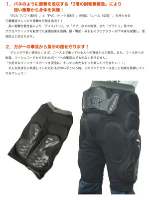 【『3層の耐衝撃構造』が尻 腰 もも等をガード!画期的シェルパンツ】 ■バネのように衝撃を吸収する「3層の耐衝撃構造」により強い衝撃から身体を保護! 「EVA(ソフト素材)」と「PVC(ハード素材)」の間に「ルーム(空間)」を持たせる三層構造でしっかり衝撃を分散&吸収!!高い衝撃分散性能により転倒時に保護効果を発揮。