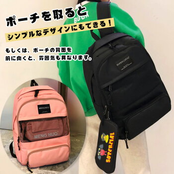 リュックサック リュック 大容量 バックパック 男女兼用 メッシュ 親子 ポーチ付き デイパック ジュニア ルックザック オシャレ 黒 ピンク カジュアル 韓国ファッション PC入れ 日帰り 通学 通勤 学生 A4 修学 旅行 収納 女の子 男の子 レディース メンズ 子供 大人気