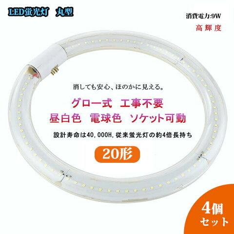 【4個セット】 丸型 LED 照明 20形 led照明 LED蛍光灯 led丸型蛍光灯 PL保険加入済み ledベースライト ledライト 昼光色 高輝度9W グロー式 工事不要 昼光色/昼白色/電球色 ソケット可動 長寿命 節電 6500K/6000K/3000K 全光束:920-1125LM BCT10-9W