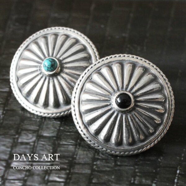 サークルコンチョに彫刻されたシンプルなデザインの中央にイミテーションのオニキスとターコイズがアクセントになっています。